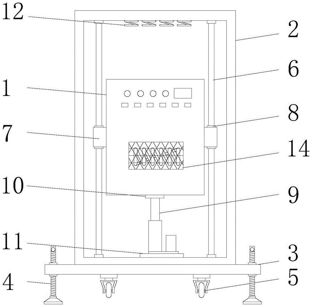 進一步,框架2的內壁頂端正對高頻加熱設備主體1的位置安裝有多個彈簧片12,彈簧片12可在高頻加熱設備主體1上升至頂部時,在高頻加熱設備主體1和框架2之間起到緩沖作用,避免框架2受到高頻加熱設備主體1的沖撞出現折斷。